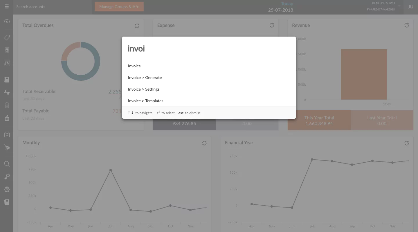 For example, with Invoice selected, search suggests three potential filters-Generate, Settings, Templates before you even type anything further.